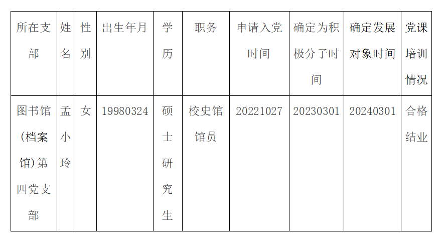 经过党支部长期培养、教育、考察和本人一贯的表现,经过政审并召开党员和群众座谈会征求意见,图书馆(档案馆)第四党支部认为孟小玲同志已基本具备党员条件,拟在近期召开支部大会讨论接收其为中共预备党员。根据发展党员有关工作要求,现将其有关情况公示如下: