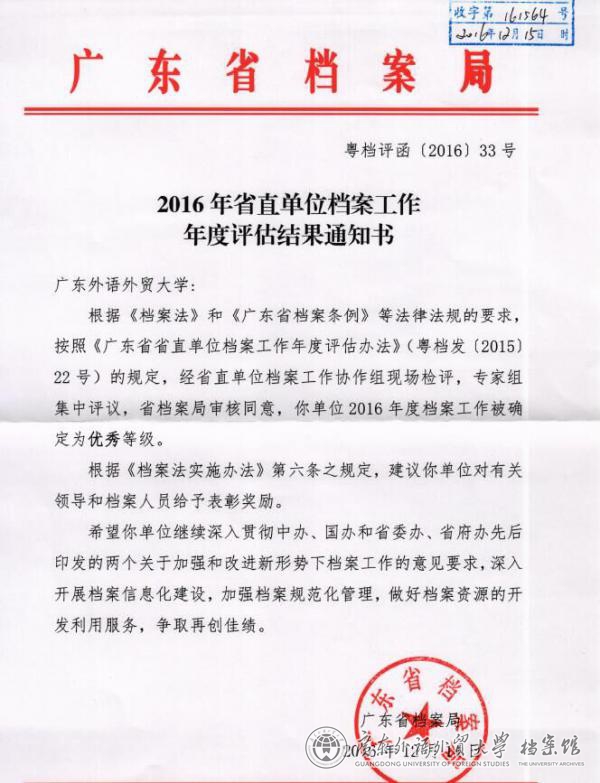 近日,在2016年省直单位档案工作年度评估中,我校档案工作被确定为优秀等级。这是我校档案工作自上一轮评估检查以来(2013年)再次获得优秀等级。在12月14日的《2016年省直单位档案工作年度评估结果通知书》中,专家组充分肯定了我校档案工作。