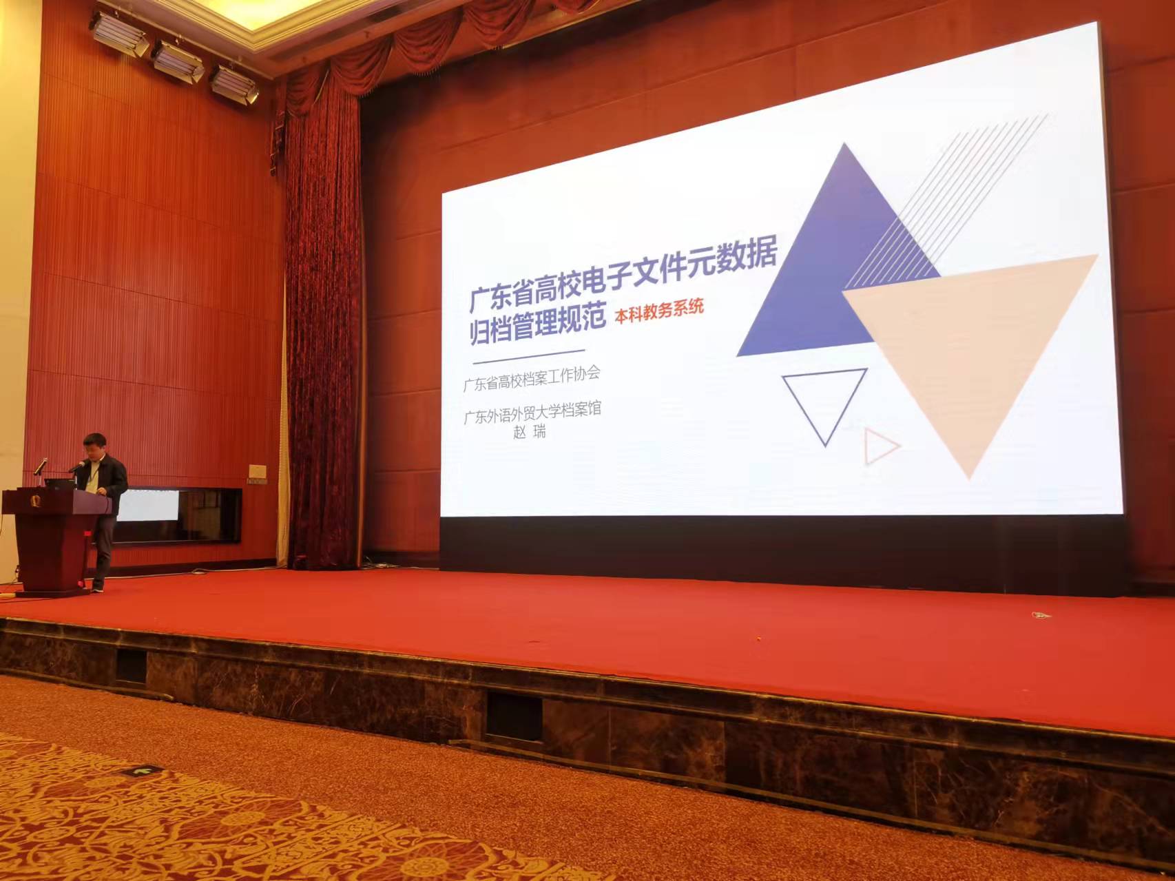此次会议也是档案业务培训会议,主要内容是关于“广东省高校电子文件归档元数据管理规范研究”项目的研究成果。该项目由协会牵头,中山大学、华南理工大学、广东工业大学,广东外语外贸大学、深圳大学、暨南大学和华南师范大学组成,2019年立项,历时1年多,于2020年12月顺利通过专家验收,在省高校档案工作协会领导的大力支持下顺利实施,将为广东高校电子文件全过程管理、面向利用的管理目标提供基础性和规范性指引。规范包括广东省高校电子文件通用元数据归档管理规范、办公自动化系统(OA)、人力资源系统、财务系统、本科教务系统、研究生教务系统、校招投标系统等7个电子文件归档管理规范,涵盖了高校最基本的业务部门。我馆信息技术室主任赵瑞做了《广东省高校电子文件元数据归档管理规范》的报告,展示和分享了我馆在档案馆信息化建设上的探索和取得的成绩。
