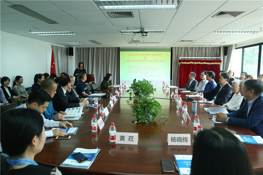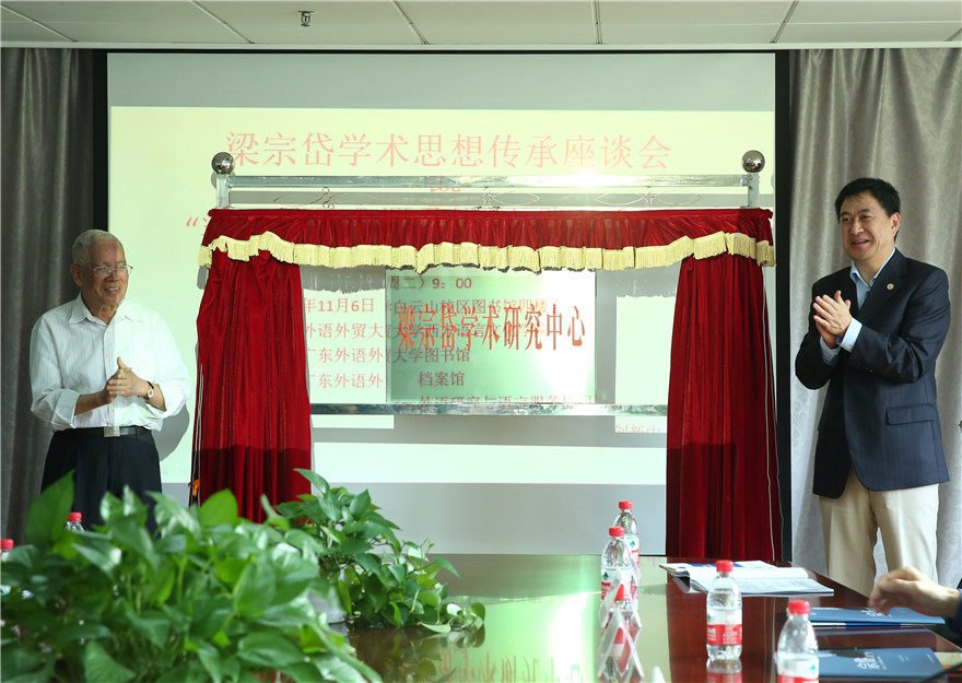 11月6日上午,梁宗岱先生逝世35周年之际,我校在北校区图书馆会议室召开梁宗岱学术思想传承座谈会暨梁宗岱学术研究中心成立大会。我校党委书记隋广军、我校原校长黄建华为梁宗岱学术研究中心揭牌。北京外国语大学原党委书记杨学义,天津外国语大学原校长修刚,中国社会科学院外文所所长陈众议,中国法国文学研究会原会长吴岳添,浙江大学世界文学与比较文学研究所所长吴笛,《法国研究》杂志主编罗国祥,中国法语教学研究会副会长刘成富,以及广外原党委书记校长徐真华,广外外国文学文化研究中心原主任栾栋,广外云山讲座教授黄荭等校内专家学者参加了座谈会。