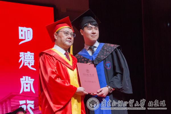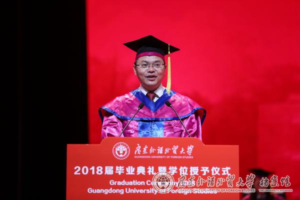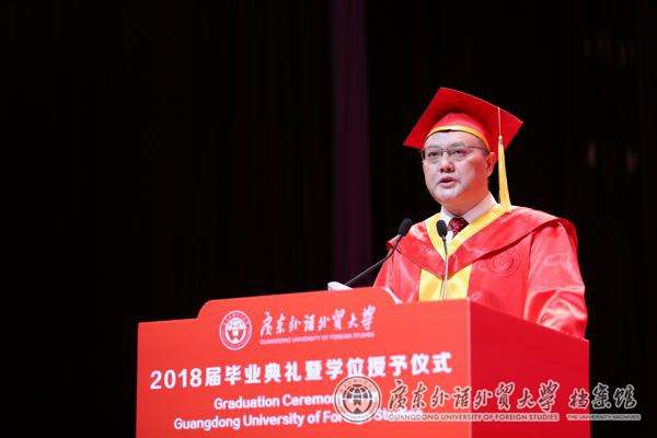 石佑启在致辞中带领毕业生回顾了在广外的时光,称赞学子们秉承“卓越、诚信、包容、自信”的广外价值观,将对真知的求索,内化在“明德尚行”的教育理念中,积淀在“学贯中西”的办学特色中,沉潜在“敢于担当”的家国情怀中,彰显在“勇于创新”的时代风骨中。他希望学子们能够审慎思考当下与长远、个人与时代之间的关系,秉持广外人质朴诚信、求真务实的传统,深怀一颗爱国心、敬畏心、平常心、进取心,做新时代的有为青年,谱写人生华章。