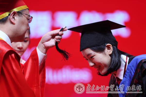 来自外文中心的博士生陶同学是全场第一位接受校长拨穗的学生。他表示,校长致辞中“尊重规则”的建议让他印象深刻。他认为,广外培育了他善于观察的能力,也让他感受到了“学贯中西”的包容气氛。英文学院的李同学已在广外就读七年,从学士毕业到硕士毕业,她仍然能从校长的寄语中汲取力量,“石校长的那句‘生活不是等待暴风雨过去,而是学会在暴风雨中翱翔’让我很受启发,因为生活就是要学会和事情一起成长才有意义。”当被问及对本场毕业典礼的感受时,留学生学院国际商务专业的黄同学说第一感受就是激动和不舍,感觉从入学到毕业就只是一瞬间。她很感谢广外给了她这么多的机会,让她能够领略不同国家的文化,这也成为她以后踏入社会的一笔可贵财富。而来自西语学院的严同学表示,他最大的感受就是时光飞逝,四年的时光只是一瞬间,今后,他将保持“爱国心、敬畏心、进取心和平常心”,奉献社会。