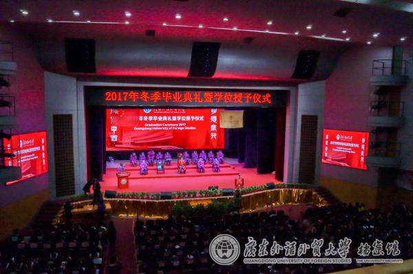 隋广军在致辞中表示,广外人共同秉持的价值观——卓越、诚信、包容和自信,“已经作为独特的精神烙印镌刻在了你们的人格品质之中”。他送给毕业生三句临别赠言:第一句是“不忘初心,要坚守梦想,践行卓越”——梦想,是一种力量,是千难万险不可阻挡的无畏,是百折不回坚定向前的执著,使我们披荆斩棘、坚定从容。卓越,是一种境界,是对创造价值、实现理想的不懈追求,使我们志存高远、敢为人先。第二句是“不忘初心,要尚学求知,包容开放”——“尚学”是一种习惯,更是一种能力,是尊崇学问、注重提升的精神追求,使我们通达世事、洞悉智慧。包容,是一种视野和思维,是应对时势变化和多元文化的胸襟气度,使我们开放和谐、融通创新。第三句是“不忘初心,要诚信立身,自信立行”——诚信,是一种底线和良知,是对为人处世根本准则的忠诚坚守,使我们求真向善、明德立身。自信,是一种心态和信念,是厚积薄发迎接挑战的精神力量,使我们果敢从容、行实致远。最后,他期望毕业生恪守“明德尚行、学贯中西”的校训精神,不忘初心,立志修德,笃学创新,在实现中国梦的生动实践中放飞青春梦想,在不懈奋斗中书写人生华章。