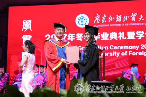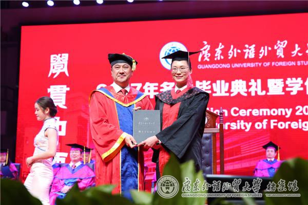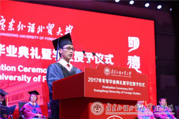 来自商学院的毕业生代表陈伟光和同学们分享了他选择在广外就读MBA学位的原因,“广外,于我,是一个回归校园初心的地方”,“广外给予我们的,不仅仅是融汇中西的知识和能力,更是价值和情怀”。他说,我们的情怀不是虚无缥缈的梦想,而是脚踏实地的努力,用自己的坚持和热爱去为这个社会的发展和进步做出点滴贡献,去证明学贯中西的价值和意义。